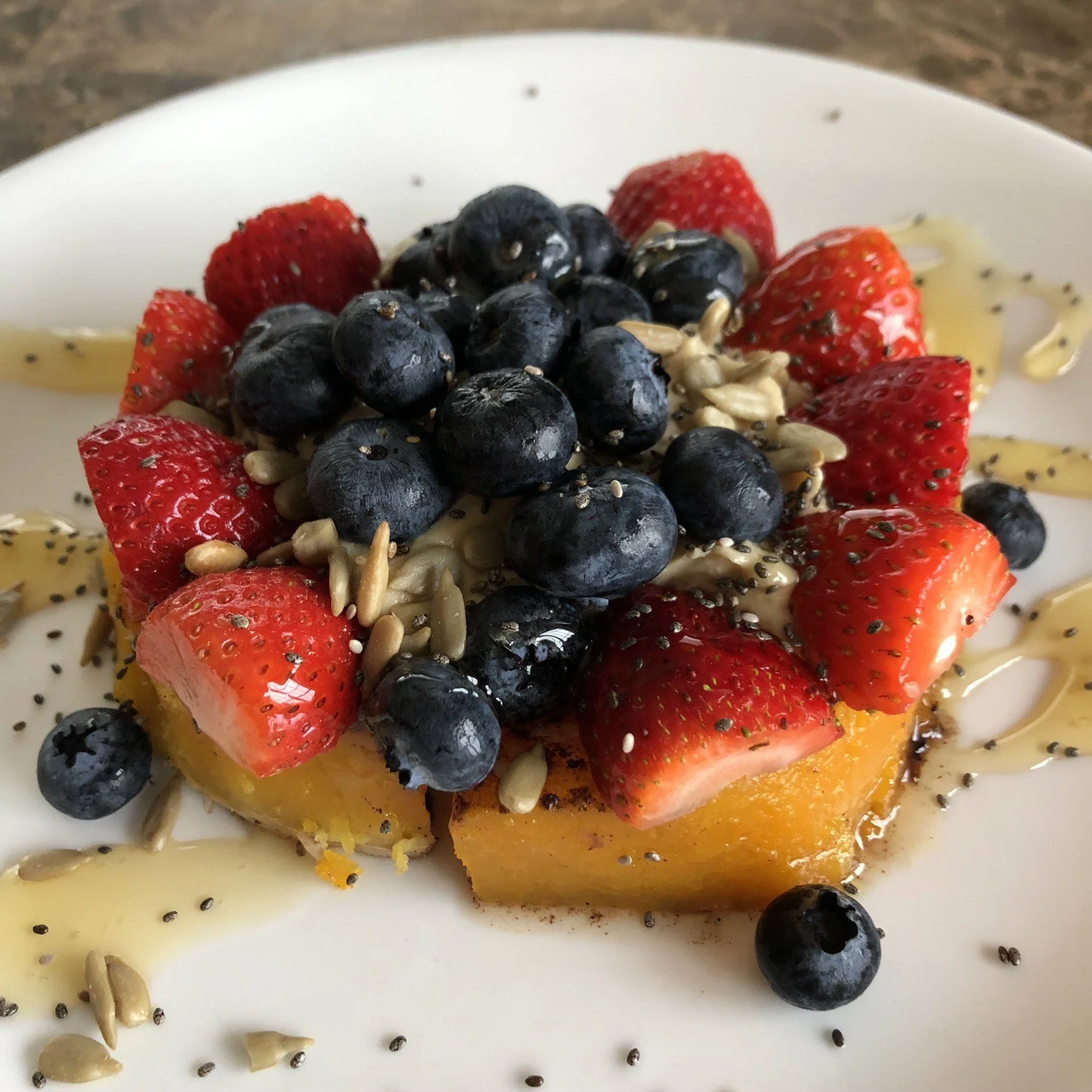 Yesterday’s breaking fast (we practice 16/8 intermittent fasting) meal was a Vegan protein yogurt bowl with fruit. The recipe called for delicata squash. I did not have this or know what this was off the top of my head. Once I looked up what this squash was, I sure wish I had it. It is known for its buttery, brown-sugar taste, delicata is also known as sweet potato squash. Going to have to try it.