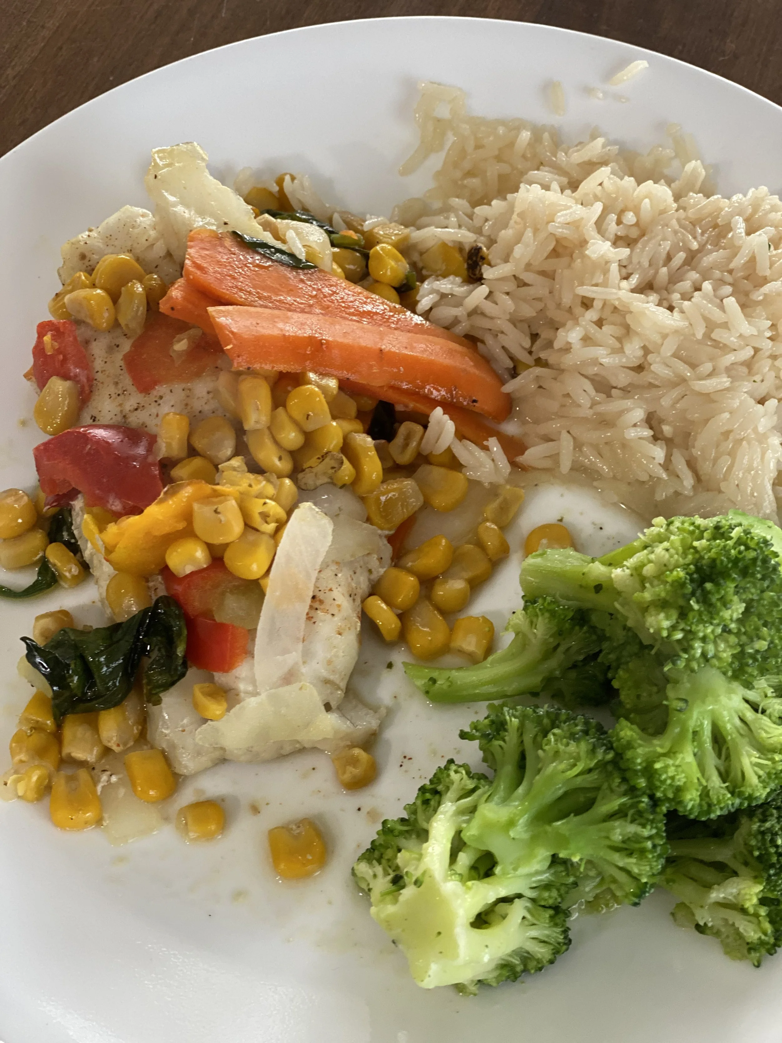 Regarding weeknight meals, I don't particularly appreciate cooking a big messy dinner. I'm tired of thinking and decision-making, so I keep our meals planned out for the week and simple. It was fish this weeknight, so I knew Kenny would be cooking when I rolled in around 530pm; wrong. He's on the tractor moving dirt. I am left to cook the fish. I d not like frying it, and sautéed fish I always dry out. I started thinking of the foil packs from the chicken and stuffing I made. Throw the fish on the stuffing mixture, add broccoli and butter and bake. Cooking the fish this way would be easy and less messy.