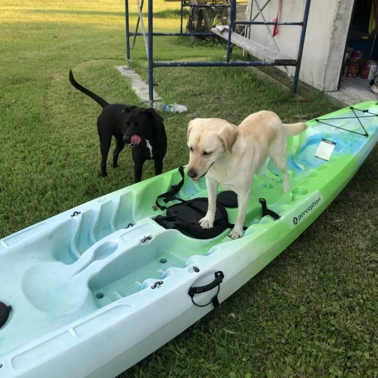 Great imagery, except Sadie and Stitch didn’t visualize this. I know this because I now have bruises across my shins and Lord help us if anyone was watching this morning. It took me 5 minutes to figure out the back of the seat has a latch to hold it up. The seat kept falling down every time I would try to sit down. It also did not help that Sadie gets really crazy when we workout, 4-wheeler or go boating. She was in and out of the kayak like it was hot lava.